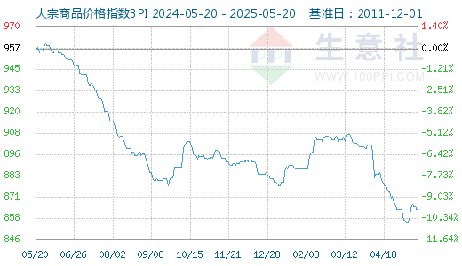 5月20日大宗商品价格指数BPI为863点, 与昨日持平 , 较周期内最高点1343点(2021-10-19)下降了35.74%,较2016年02月03日最低点660点上涨了30.76%。
