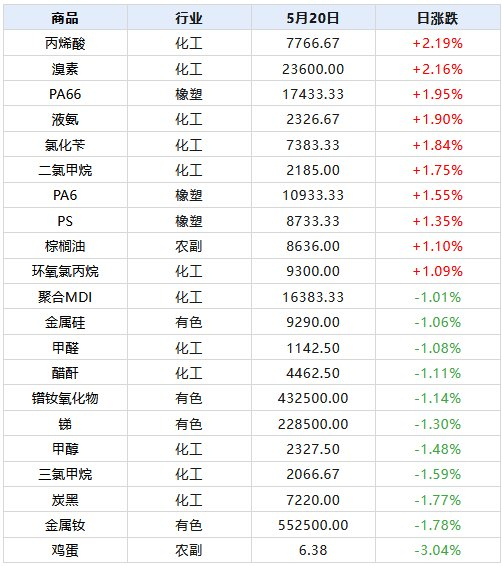 据生意社价格监测,2025年5月20日大宗商品价格涨跌榜中环比上升的商品共30种,集中在化工板块(共13种)和农副板块(共5种),涨幅前3的商品分别为丙烯酸(2.19%)、溴素(2.16%)、PA66(1.95%)。环比下降的商品共68种,集中在化工(共31种)和有色(共17种),跌幅前3的商品分别为鸡蛋(-3.04%)、金属钕(-1.78%)、炭黑(-1.77%)。