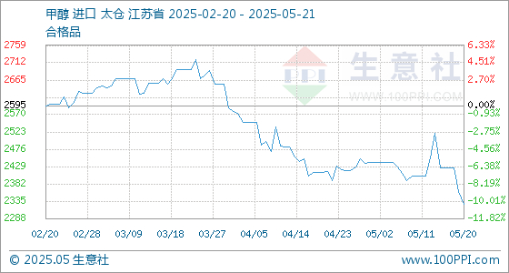 5月21日,生意社甲醇基准价为2327.50元/吨,与本月初(2440.00元/吨)相比,下降了-4.61%。