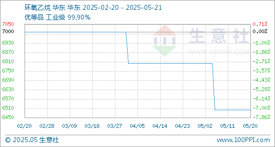 5月21日,生意社环氧乙烷基准价为6500.00元/吨,与本月初(6800.00元/吨)相比,下降了-4.41%。