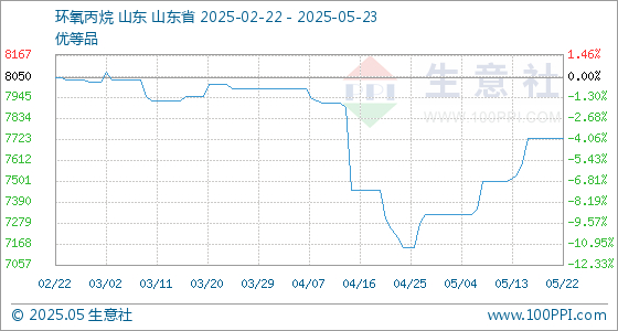 5月23日,生意社环氧丙烷基准价为7725.00元/吨,与本月初(7325.00元/吨)相比,上涨了5.46%。