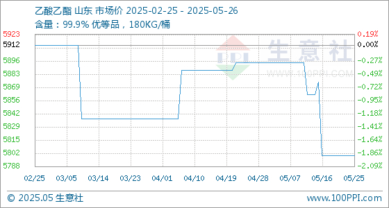 5月26日,生意社乙酸乙酯基准价为5800.00元/吨,与本月初(5895.00元/吨)相比,下降了-1.61%。