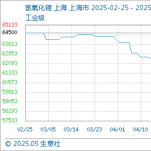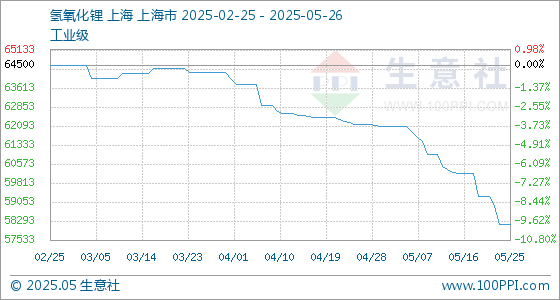5月26日生意社氢氧化锂(工业级)基准价为58166.67元/吨