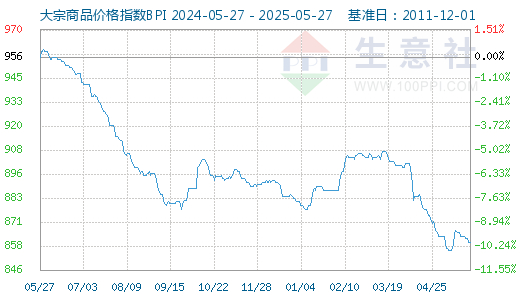 5月27日大宗商品价格指数BPI为860点, 与昨日持平 , 较周期内最高点1343点(2021-10-19)下降了35.96%,较2016年02月03日最低点660点上涨了30.30%。
