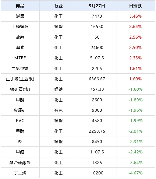据生意社价格监测,2025年5月27日大宗商品价格涨跌榜中环比上升的商品共33种,集中在化工板块(共16种)和建材板块(共4种),涨幅前3的商品分别为炭黑(3.46%)、丁腈橡胶(2.64%)、盐酸(2.56%)。环比下降的商品共75种,集中在化工(共35种)和钢铁(共9种),跌幅前3的商品分别为丁二烯(-4.67%)、聚合硫酸铁(-3.64%)、甲醛(-2.42%)。