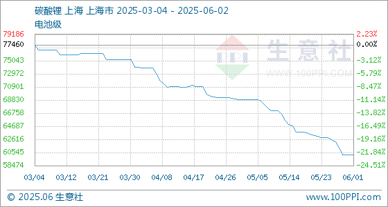 6月2日生意社碳酸锂(电池级)基准价为60200.00元/吨