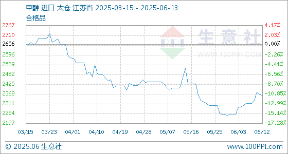 6月13日,生意社甲醇基准价为2362.00元/吨,与本月初(2250.00元/吨)相比,上涨了4.98%。