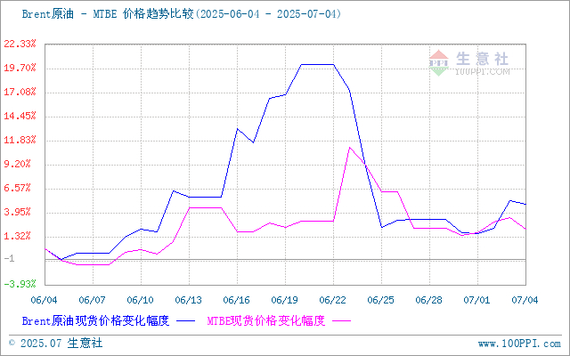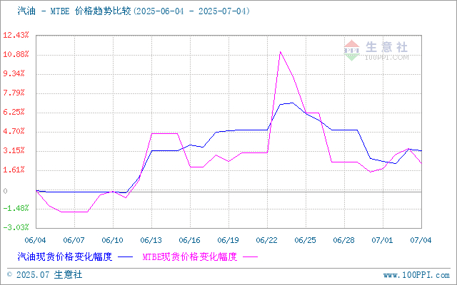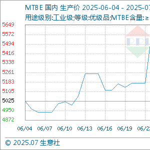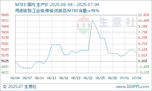 据生意社商品行情分析系统,6月30日至7月4日,MTBE价格自5097元/吨先涨后跌至5132元/吨,周期内价格涨幅0.69%,环比上涨2.14%,同比下跌21.79%。国内MTBE市场行情窄幅波动为主,随着原油行情变动整理。