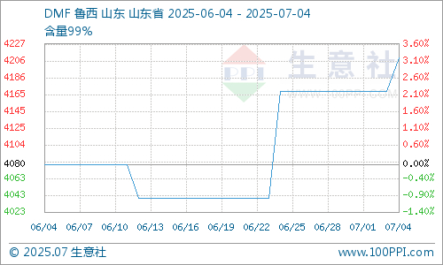 根据生意社商品行情分析系统显示:截止7月4日国内优等品DMF企业报价均价在4210元/吨,本周DMF市场价格上行,价格相比上周同期上涨了1.2%,DMF厂家不断上调价格,DMF价格走势偏强。