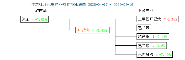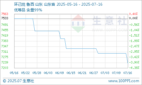 根据生意社监测的数据显示,截止7月16日,国内工业级优等品环己烷均价在7233元/吨,价格相比上周同期下跌了0.91%,环己烷市场持稳运行,价格没有明显变化小幅下滑,目前下游需求不足,价格上涨动力不足,按需补货为主,现货市场供应充足,短期内供需平衡运行为主。