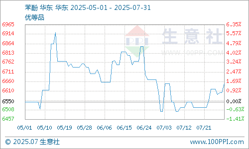7月国内苯酚市场区间波动。据生意社监测的数据显示,从全国市场来看7月1日国内苯酚市场价格6680元/吨,7月31日国内苯酚市场价格6667元/吨,其中华东市场最低跌至6500元/吨。