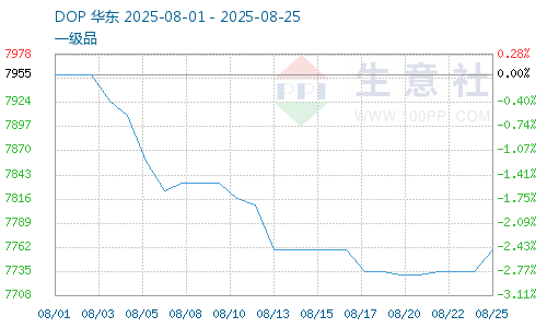 据生意社商品行情分析系统,截止8月25日,DOP价格7759.16元/吨,较8月15日DOP价格7759.16元/吨先跌后涨。本周DOP企业小幅回落,增塑剂产量充足,异辛醇需求稳定,异辛醇价格上涨支撑减弱。