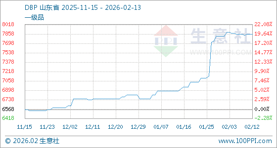 2月13日,生意社DBP基准价为7851.67元/吨,与本月初(7818.33元/吨)相比,上涨了0.43%。