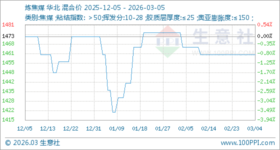 3月5日生意社炼焦煤基准价为1461.25元/吨