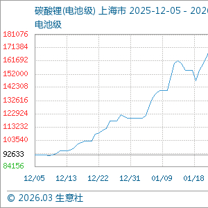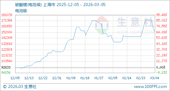 3月5日生意社碳酸锂(电池级)基准价为153000.00元/吨