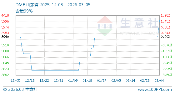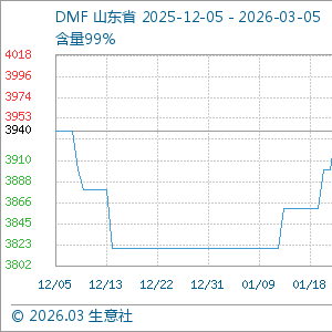 3月5日,生意社DMF基准价为4000.00元/吨,与本月初(3940.00元/吨)相比,上涨了1.52%。