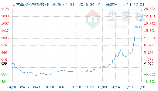 3月31日大宗商品价格指数BPI为1103点, 较昨日上升了4点 , 较周期内最高点1343点(2021-10-19)下降了17.87%,较2016年02月03日最低点660点上涨了67.12%。