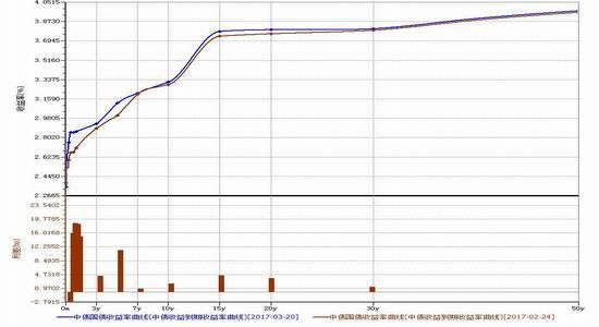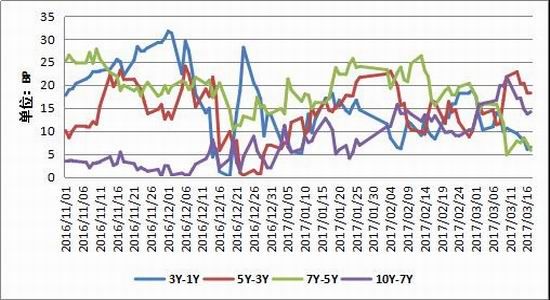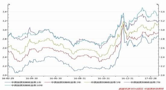 从国债现货市场来看,银行间国债关键期限二级市场收益率持续处于上升阶段,并突破2016年底的收益率高点。短期国债收益率上涨幅度大于中长期国债。从10年期国债期限结构来看,收益率整体上移,短期国债收益率大幅上涨,中长期国债收益率小幅上升。预计未来,国债收益率期限结构会逐步变平。利多长期国债。