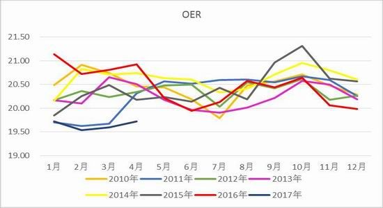 虽然4月MPOB报告的影响十分利多,但我们不可否认的是,产区的产量确确实实在恢复,而且恢复的力度并不算差。根据鲜果串单产FFByield的数据来看,目前进入2017年以来鲜果串的单产环比增幅高于平均年份的增长幅度,这也验证了降雨量对鲜果串单产有8-10个月的滞后影响因素,由于2016年下半年产区降雨量充沛,后期鲜果串的单产将会继续恢复良好。但值得注意的是近期鲜果串的出油率oer较低,这要归结于近期产区降雨量偏多,导致总日照时间偏短,从而不利于果子的出油,预计5-6月份果子出油率仍将偏低。