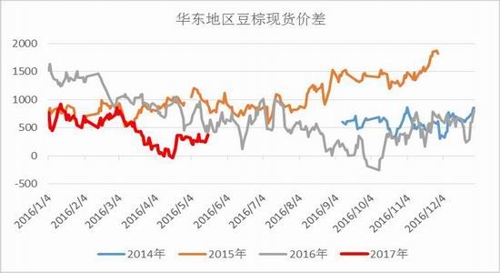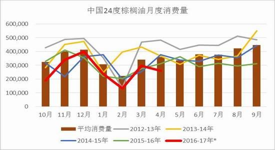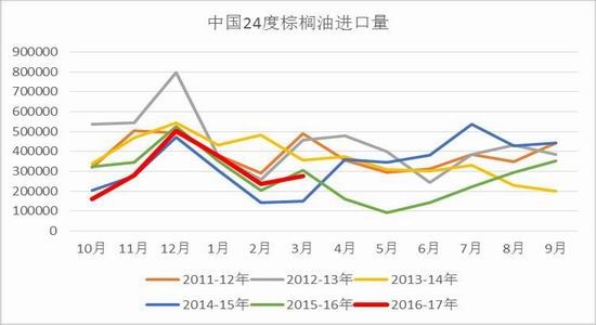 由于近期24度棕榈油进口利润持续倒挂,进口窗口迟迟未打开,因而国内买船积极性持续较差,前期甚至有取消船期的现象。截至3月末,2016-17年度国内累计进口24度棕油为160万吨,为历史同期最低进口量。供应端进口量持续偏少,需求端也同样不旺盛。由于国内豆棕价差持续低于“正常区间”,华东现货豆棕价差只有200-300元左右,终端低度棕油消费异常疲软,表观消费几乎已为挤压至刚需,进而豆油开始大量的挤占棕油的消费。