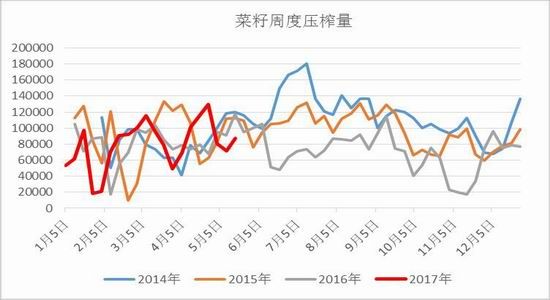 截至4月份,2017年我国累计进口油菜籽达到170万吨,高于过去历年来同期进口量,同时预计5-6月份国内油菜籽到港量同比继续增加。虽然进入5月以后由于菜籽压榨利润大幅走低,部分油厂开工率下降,但后期随着菜籽到港的增加压榨量会有所提升,菜油终端的高库存压力仍将持续。目前华东和华南地区总港口商业库存较上个月继续小幅增长至43万吨,菜油现货压力持续,现货基差疲软,国内港口菜油库存出现明显的回落可能要到3季度后期。