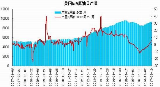 美国油服公司贝克休斯(BakerHughes)公布数据显示,截至5月19日当周美国石油活跃钻井数为722座,为2015年4月以来最高,比去年同期增加402座。美国天然气活跃钻井数增至180座,比去年同期增加95座。美国石油和天然气活跃钻井总数为901座,较去年同期增加497座。美国能源情报署(EIA)的数据显示,截止5月21日当周的美国原油日均产量932万桶/日,比上年同期日均产量增加55.3万桶/日,增幅为6.31%。截止5月19日的四周,美国原油日均产量930.8万桶,比上年同期增长5.8%。美国原油日均进口量829.4万桶,成品油日均进口量220桶。美国能源信息署发布的《短期能源展望》调高了对今明两年美国的原油产量预期。预计2017年美国原油日均产量931万桶,较此前的预期上调1%。预计2018年美国原油日均产量996万桶,较此前的预期上调了0.6。预计6月美国主要页岩油产区的原油产量将达到540万桶/日,这是2015年5月份以来的最高水平。随着钻井数的持续增加,美国原油产量延续增长趋势。