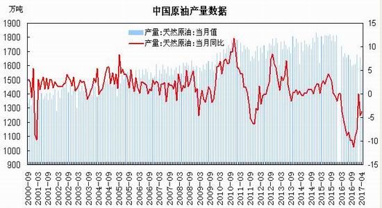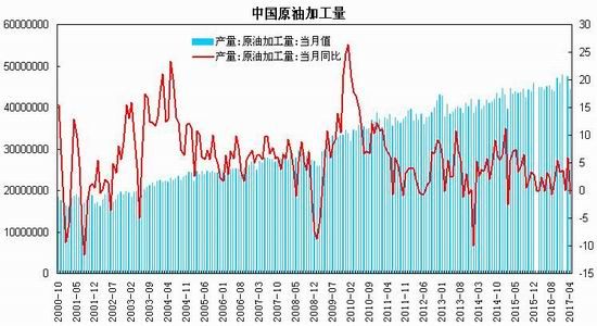 中国统计局数据显示,4月份国内原油产量为1599万吨,同比下降3.7%;1-4月份国内原油产量为6400.9万吨,同比下降6.1%,延续了2016年以来的下降趋势;4月原油日均产量389万桶/日。4月中国原油加工量为4445.2万吨,较上月环比减少260.3万吨,与去年同期相比下降0.6%;1-4月中国原油加工量为1.83亿吨,同比增长3.1%。