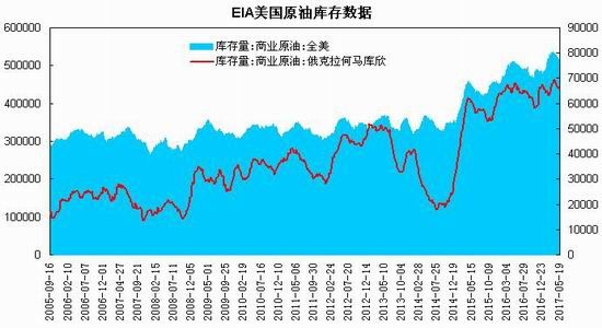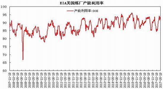 5月份美国原油库存从高位连续第七周出现下降,累计减少1920.3万桶,降幅约3.6%,库欣地区原油库存较去年下降3%,美国炼油厂开工率维持在2015年11月以来的高位水平,随着夏季汽油消费旺季的到来,炼油厂保持较高开工水平有助于削减处于历史高位的美国原油库存。