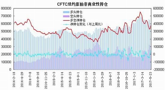 美国商品期货交易委员会(CFTC)公布的数据显示,截至5月23日当周,NYMEX轻质原油原油期货商业性多头持仓为816945手,较4月份增加78777手,商业性空头持仓为1185496手,较4月份增加13703手,商业性净空持仓为368551手,较4月份减少65074手,降幅为15%。非商业性多头持仓为595499手,较4月底减少23257手,非商业性空头持仓为222510手,较4月增加15576手,非商业性净多持仓为372989手,较4月减少38833手,降幅为9.4%。