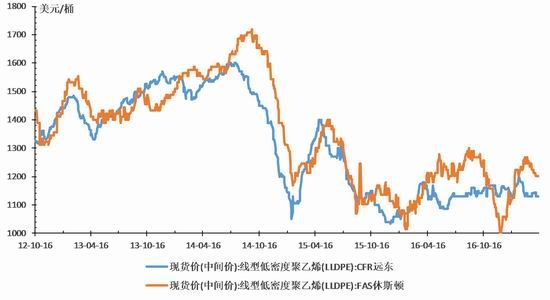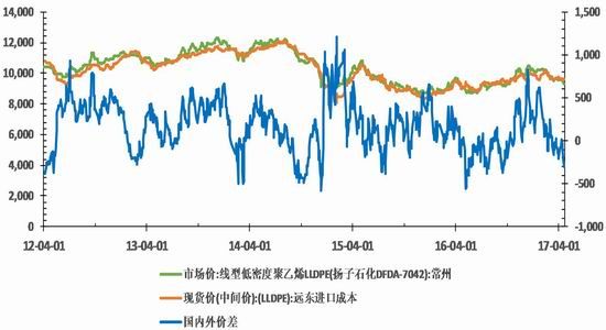 5月PE现货市场价格总体上先扬后抑,价格重心有所上移。由于5月份下游需求不济,地膜逐渐收尾。另外因为环保压力,中小下游工厂开工不佳。PE现货价格有所回落,之后,欧美原油价格止跌上涨,加之PE装置检修增加,尤其是一些LLDPE装置的检修,PE库存也开始逐步回落,PE现货价格开始止跌回升。截至5月19日,国内线性主流价格维持在9000-9450元/吨。其中LLDPE(扬子石化DFDA-7042):常州市场价回升至9450元/吨,比月初的9150元/吨上涨300元/吨。进口PE方面,截至5月19日,沙特218WJ进口价格为1120美元/吨,折合人民币价格为9725元/吨,与大庆7042的价差为375元/吨,仍然处于倒挂状态,这将抑制进口LLDPE数量。