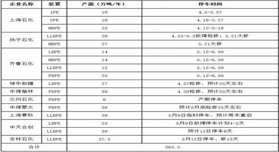 据卓创资讯,4月适逢检修高峰期,多数石化企业装置陆续停车检修。除了兰州石化6万吨老全密度装置长期停车外,其他炼化企业检修时间在2-50天不等。其中茂名石化高压和低压装置检修2-7天,燕山新高压装置检修2天,四川石化低压装载机检修5天,中原MTO和线性装置分别检修20天和5天,武汉乙烯低压和线性装置分别检修2天和12天,齐鲁石化高压装置检修50天,上海金菲低压装置检修40天,上海石化高压和低压装置分别检修50天和35天。本月涉及检修产能共计484.5万吨,损失量在10.97万吨,环比增加3万吨。