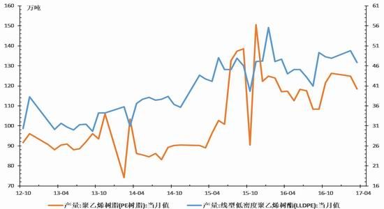 从产量来看,2017年4月份PE当月产量为118.5万吨,同比增加1.28%,累计总产量为494.1万吨,同比增加1.25%。其中LLDPE当月产量为46.8万吨,同比减少1.89%,累计总产量193.9,累计同比减少1.87%。