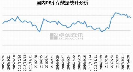 据卓创数据统计分析,截至5月12日国内PE库存环比5月5日下降2.37%,其中国内石化企业PE库存环比减少5.14%,国内PE港口库存环比下降0.78%,国内贸易企业PE库存环比下降1.7%。目前PE库存较前期有所消化。