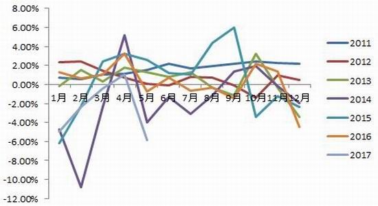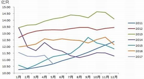 鸡蛋供应存在下滑预期。影响鸡蛋供应的主要在于在产蛋鸡存栏数量及产蛋率。蛋鸡存栏方面,2016年12月以来在产蛋鸡存栏环比持续为负,导致存栏持续回落。不过4月份,在产蛋鸡存栏环比转正,存栏量出现一定回升,4月份在产蛋鸡存栏量增加的原因为11、12月份青年鸡存栏增加明显,因当时养殖利润尚可,且正好对应端午消费旺季,所以推动当时的补栏热情,雏鸡补栏后大概4-5个月产蛋,进而导致4月份在产蛋鸡存栏有所回升。但这种回升并不具有持续性,5、6月份便存在再度下降的预期。逻辑在于我们看到,2017年1月份开始养殖利润开始不断下滑,利润下滑往往会导致雏鸡补栏不足,芝华数据显示,1-3月幼雏鸡的存栏均成环比下滑态势,进而导致2-4月份青年鸡存栏整体呈下降态势,进而会导致5-7月份左右的在产蛋鸡的存栏量应该也会下降,这是一连串的链条因果反应。根据芝华最新数据,5月在产蛋鸡存栏环比下滑5.87%,此为近年最低水平。同时,近月随着利润下滑导致高龄蛋鸡淘汰相对加速,双向压缩下会进一步降低在产蛋鸡的存栏量,根据利润及青年鸡、淘汰鸡情况,初步预计后续至少在7月份之前在产蛋鸡的存栏仍有下降预期。