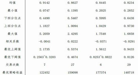 计算结果表明,最优下阈值为0.7041~0.7093,最优上阈值为0.8684~0.8697,策略收益为383114元,交易次数较少,仅为4次,具体方案为2860元卖空期货,2609元买入平仓并开多头,2913元多头平仓并反向卖空,2943元止损。