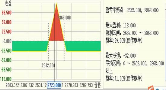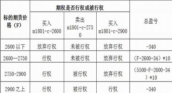 某机构投资者通过分析豆粕市场,认为近期美豆丰收后,天气炒作因素结束,即导致豆粕价格大幅波动的事件发生属于小概率,判断后市豆粕价格或将在2700—2900之间震荡,局部因素可能导致波动幅度超过200点,因此其决定在豆粕期权市场上进行蝶式期权策略操作。具体而言,该投资者,以160元/吨的价格买入1手m1801-c-2600合约,以44元/吨的价格买入1手m1801-c-2900合约,以85元/吨的价格卖出2手m1801-c-2750合约,同时下单并成交。该机构投资者的资金使用,除结算保证金之外,其支出成本为8.5元/吨(160+44-85*2=34元,34/4=8.5元),合计支出保证金340元。不计算资金使用成本和交易佣金,本策略最大风险为340元(净支付的保证金),最大的盈利为1160元(期权到期时,豆粕期货1801合约价格为2750元/吨,买入看涨m1801-c-2600期权合约行权,其他合约放弃行权和被行权,此时盈利最大,总收益为(2750-2600-34)*10=1160元)。该策略的盈亏平衡点分别是到期日豆粕期货1801合约价格为2868或2632,在【2632,2868】之间就会盈利,在这个价格之外,就会出现亏损。