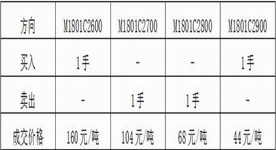 某投资者通过研究分析认为,豆粕价格区间震荡的可能性比较大,其在期权市场上采用飞鹰式套利策略,具体策略构造如下: