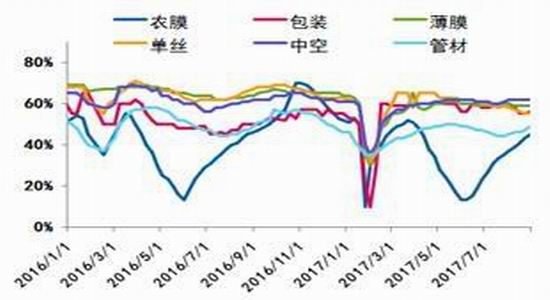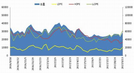 据卓创统计显示,截至9月上旬,下游装置开工率小幅回升,下游农膜开工率约47%,开工率逐步回升;包装膜开工率56%,薄膜开工率60%,单丝56%,中空63%,管材50%,环比均小幅回升。今年受环保检查影响,整体需求启动慢,进入金九银十需求小旺季,预计需求继续小幅回升。