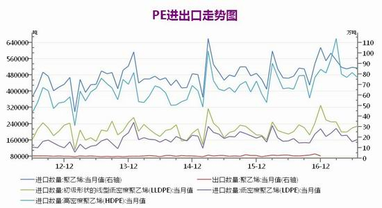 据海关统计数据显示,进口方面:2017年7月PE进口85.92万吨,环比减少0.5%,同增加10.33%。1-7月份累计进口563.17万吨,同比增加0.85%。LDPE进口16.39万吨,环比减增加7.53%,同比减少1.9%,1-7月份126.93万吨,同比增加4.89%。HDPE进口46.53万吨,环比减少5.32%,同比增加13.34%,1-7月份累计361.67万吨,同比增加21.45%。 LLDPE进口22.89吨,环比增加3.58%,同比增加14.05%,1-7月份累计161万吨,同比增加15.3%。