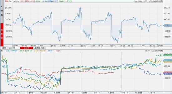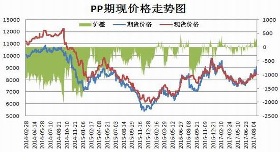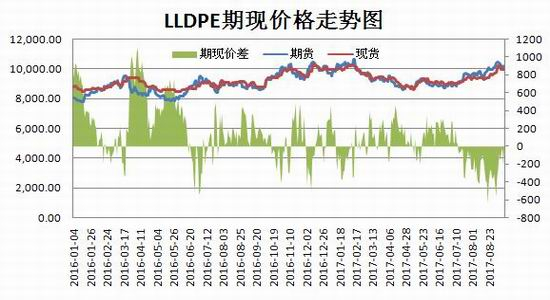 截至9月11日,塑料华北地区7042报价10000元/吨,LLDPE1801的期货报价10020,两者基差-20。前期受国内禁止废塑料及原材料上涨、下游旺季需求预期等消息影响,期价快速走高,一度升水现货超400元/吨,随后下游需求力度跟进不足,市场供应增加,期价快速回落修复基差。