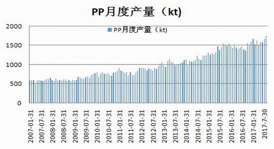 2017年8月国内PP产量为174.94万吨,环比增长4.77%,同比增长15.57%,1-8月PP累计产量为1296万吨,同比增长11.44%。随着装置开工率回升,8月份PP月度产能环比出现增加。近年来PP新增产能增速较快,产量增幅较为显著。