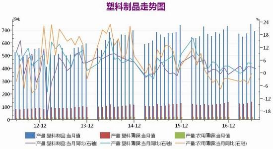 2017年7月份国内塑料制品产量689.5万吨,环比减少7.83%;6月份塑料薄膜总量为138.9万吨;农用薄膜总量为19.8万吨;泡沫塑料总量为26.6万吨;塑料人造革、合成革总量为33万吨;日用塑料制品总量为75.5万吨。1-7月塑料制品的总产量为4530万吨,同比增长3.7%。农用薄膜产量同比呈现回升态势,其它塑料制品同比出现放缓。
