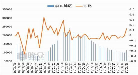 从隆众统计图来看,截止8月21日,华东地区库存量在10万吨左右,较7月份同期继续下降1.5万吨左右。华南地区库存量在3.8万吨左右,较7月份减少0.6万吨。8月份虽然检修企业不多,但是山东、新疆、四川等地受环保督查影响,开工不足,供应紧张。且内蒙地区受70周年大庆影响,开工不稳,部分企业负库存严重。8月最后一周,交割库库存增加明显,华东整体库存指数在11.3万吨,华南地区库存还是呈下降走势,在3.7万吨左右。