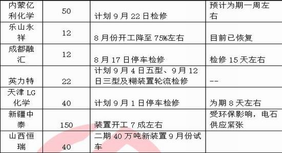 据卓创资讯统计,8月我国聚丙烯装置检修损失量约在18.5万吨,环比七月份的26.3万吨减少26.66%。8月有中煤蒙大、宁波福基、蒲城清洁能源、大唐多伦、呼和浩特、齐鲁石化装置因故障临时停车。9月神华包头、大唐多伦、神华新疆、蒲城清洁能源等装置计划停车检修,10月初联泓新材料装置计划检修,预计检修产能共计180万吨。