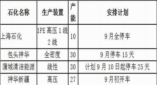 9月份装置检修力度下降,目前计划检修的装置有上海石化10万吨/年PE高压装置;包头神话30万吨/年的全密度装置,计划检修15天;蒲城清洁能源30万吨/年线性装置计划检修25天。预计9月份装置检修损失量大约在3.5万吨左右。二季度装置检修损失量大约在62.74万吨,三季度检修损失量约23万吨,四季度检修损失量缩减。