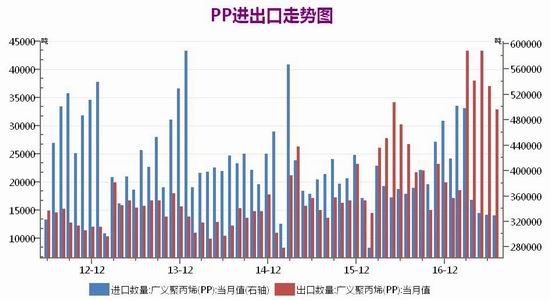 据海关统计数据显示,2017年7月PP粒进口量32.96万吨,同比减少9.4%,出口量3.29万吨,同比增加22.92%。 2016年1-7月份PP粒进口总量182.13万吨,同比增加9.94%;PP粒出口总量20.28万吨,同比增加28.84%。