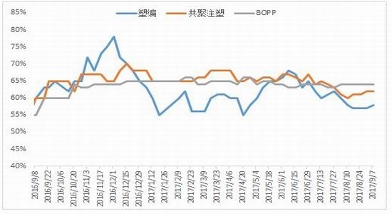 截至9月上旬国内聚丙烯下游行业整体开工率在61%左右。其中塑编行业在58%,共聚注塑开工率在62%,BOPP开工率在64%。