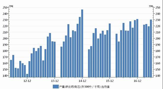 截至2017年6月国内电石产量为230.3万吨,去年同期224.95万吨,同比增加2.14,环比增加4.9%。7-8月份受环保影响开工率下降比较严重,预计电石产量呈现缩减。