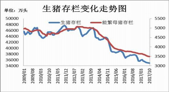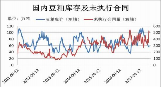 农业部公布的数据显示,2017年10月能繁母猪存栏环比下滑0.3%,比去年同期减少5.3%;生猪存栏环比减少0.2%,比去年同期减少6.6%。截至10月分,生猪和能繁母猪存栏量已经连降六个月。能繁母猪存栏下降趋势仍未终止,制约生猪产能恢复速度,间接抑制饲料消费需求的增长。不过,随着春节等重要节日时间点逐渐临近,养殖户需要为节前集中出栏作为准备,也就是要喂养大猪,短期饲料需求有所回暖,11月份豆粕成交量有明显放量,有助于库存的消耗,从而支持油厂的挺价心理。待春节的到来以及过后,养殖行业将进入季节性淡季,远期饲料需求预计将出现阶段性疲软。
