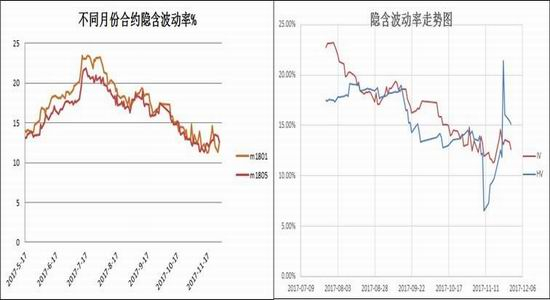 主力换月至m1801以来,对应的期权系列的隐含波动率整体处于下行趋势,从22%左右下降至当前的12.58%,11月16日最低,为11.28%。本月的隐含波动率即使在 USDA 11月供需报告公布前后仍处于下行趋势,但在本月第三周受标的期货大幅上涨,波动重心上移的影响,隐含波动率有所回升,截止11月28日,当月下降2.26%。m1805期权系列的隐含波动率自挂牌上市以来走势呈现先上升后下降的态势,当前亦受高位震荡的影响小幅回升,当前为12.63%,截止11月28日,当月下降0.33%。